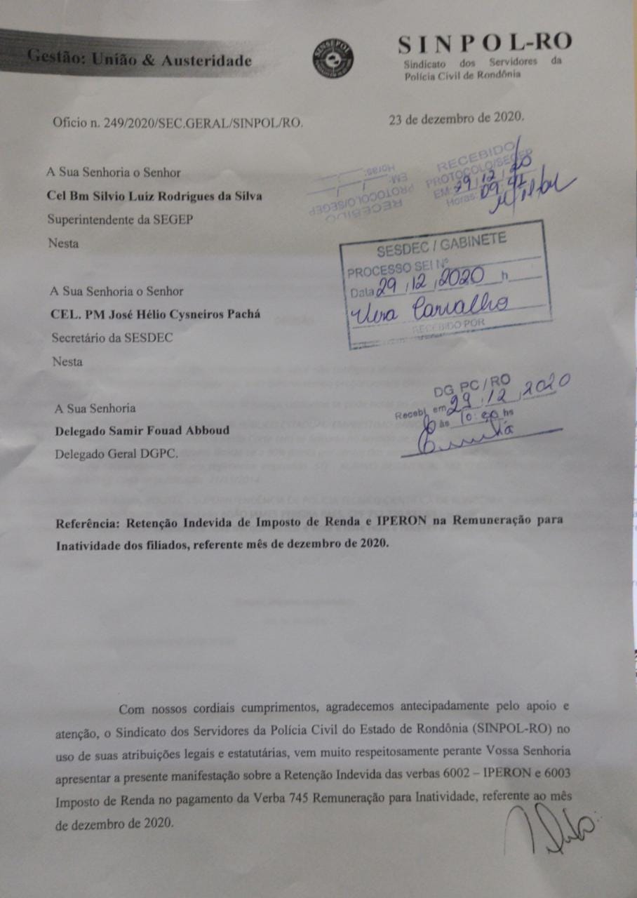 A Diretoria do SINPOL-RO comunica para todos os seus filiados que protocolou expediente junto a Superintendência Estadual de Gestão de Pessoas (SEGEP), Secretaria Estadual de Segurança, Defesa e Cidadania (SESDEC) e Delegacia Geral de Policia Civil (DGPC) apresentando manifestação sobre a Retenção Indevida das verbas 6002 – IPERON e 6003 Imposto de Renda no pagamento da Verba 745 Remuneração para Inatividade, referente ao mês de dezembro de 2020.