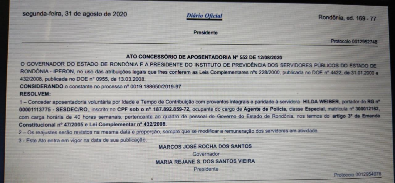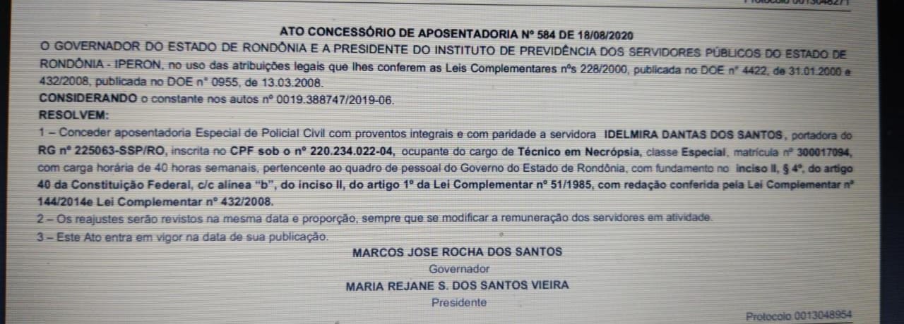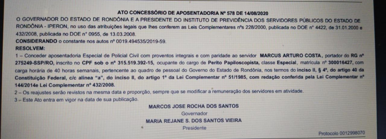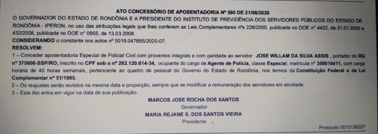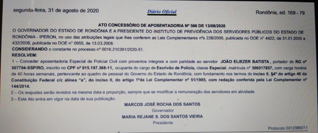 A diretoria do Sindicato dos Servidores da Polícia Civil de Rondônia (SIINPOL-RO), informa a publicação no Diário Oficial do Governo de Rondônia, dos nomes de policiais civis que receberam o benefício da aposentadoria especial com salário integral e com PARIDADE, após relevantes serviços prestados à Segurança Pública e ao Estado de Rondônia.