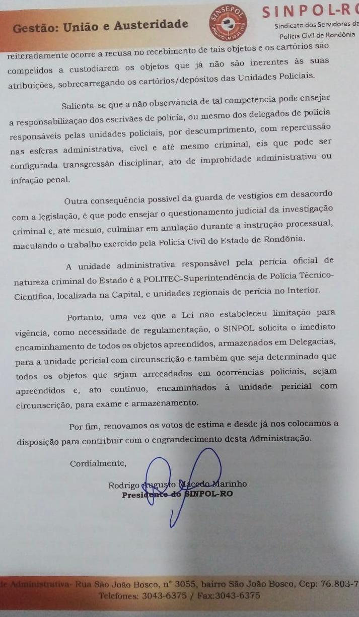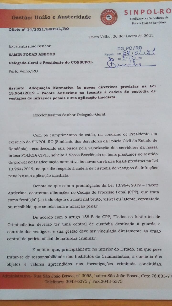A Diretoria do SINPOL-RO, protocolou nesta quinta-feira (28), na Diretoria Geral da Polícia Civil-RO (DGPC), ofício de nº 14, em que requer providências para adequação normativa às novas diretrizes legais previstas na Lei 13.964/2019, no que diz respeito à cadeia de custódia de vestígios de infrações penais e sua aplicação imediata.