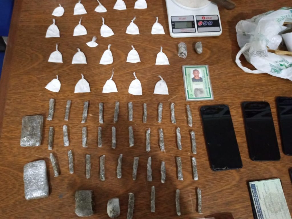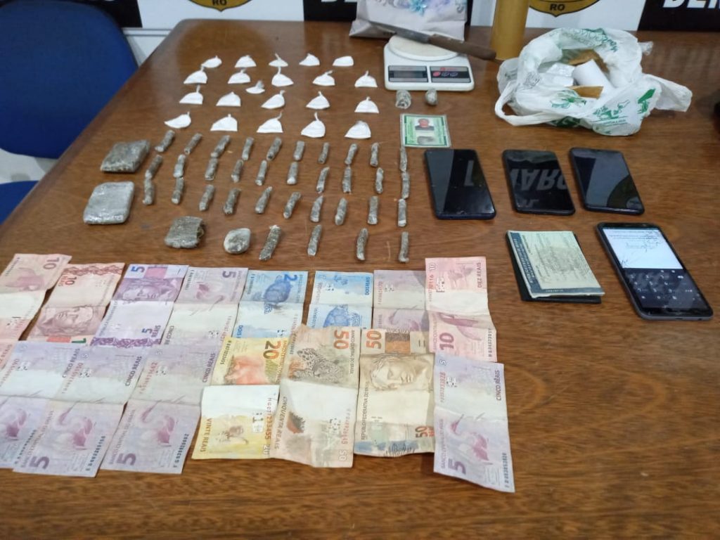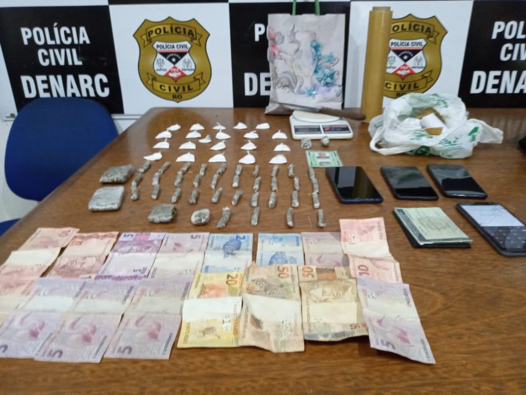 Policiais civis lotados no Departamento de Narcóticos (Denarc) prenderam no fim da tarde desta terça-feira (23), em Porto Velho, Higor e Thales, sob a acusação de tráfico de drogas. De acordo com relatos feitos no Boletim de Ocorrência, a prisão aconteceu quando os policiais faziam o comprimento de um mandado de busca e apreensão em um local apontado como sendo o “Beco da Júlia”. No local, segundo a ocorrência, houve troca de tiros com os traficantes. Durante o confronto, os suspeitos empreenderam fuga deixando apenas uma menor de 15 anos na boca de fumo. Ainda de acordo com o Boletim de Ocorrência, os policiais continuaram as buscas e prenderam Higor e Thales, porém Francisco Rafael conseguiu fugir. No local era um verdadeiro escárnio com a sociedade, pois os traficantes estavam enrolando droga no quintal da casa. No total, 60 poções droga entre cocaína e maconha foram apreendidas. A operação foi realizada no bairro Teixeirão, Zona Leste de Porto Velho. Higor já foi preso na mesma imediação, em 2018, sendo reincidente no mesmo crime.