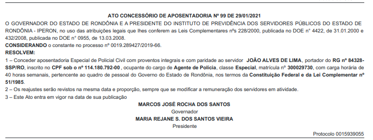 A diretoria do Sindicato dos Servidores da Polícia Civil de Rondônia (SINPOL-RO), informa a publicação no Diário Oficial do Governo de Rondônia, dos nomes de policiais civis que receberam o benefício da aposentadoria especial com salário integral e com PARIDADE, após relevantes serviços prestados à Segurança Pública e ao Estado de Rondônia.