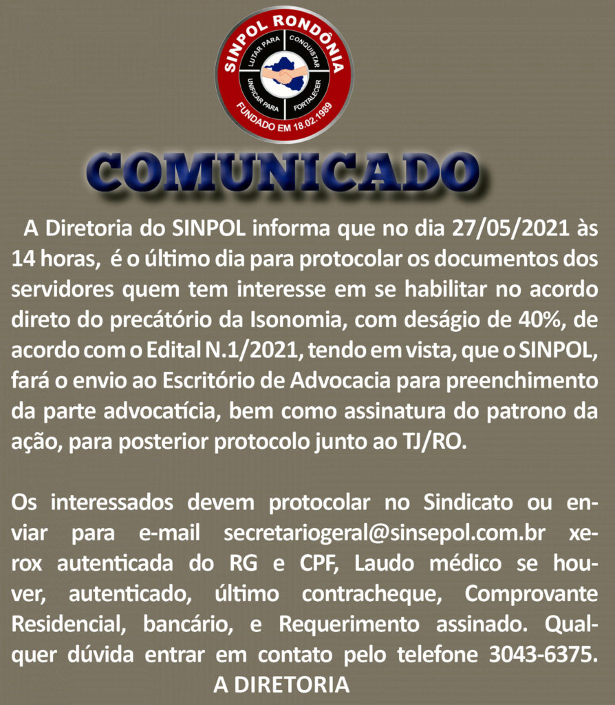 Sinpol-RO informa prazo final para acordo do precatório e isonomia